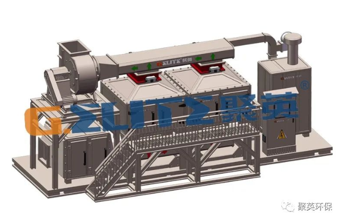 由環(huán)保離心風(fēng)機(jī)將大風(fēng)量、低濃度有機(jī)廢氣吸入沸石吸附床,在吸附床內(nèi)與多層蜂窩狀沸石充分凈化(吸附),沸石內(nèi)部逐漸富集濃縮大量有機(jī)廢物,而潔凈的氣體則排入大氣;通過燃燒裝置產(chǎn)生的高溫氣體經(jīng)換熱之后通入活性炭吸附床,使內(nèi)部有機(jī)廢物300-500℃高溫氣化從活性炭孔隙中逸散而出,此時的廢氣濃度遠(yuǎn)遠(yuǎn)高于初始吸附的廢氣濃度,然后進(jìn)入催化燃燒裝置(350℃)進(jìn)行氧化分解成CO 和H O等無害氣體,氣體經(jīng)由熱交換器將熱量傳遞再次用于脫附,排入大氣,以此完成一整套凈化流程。